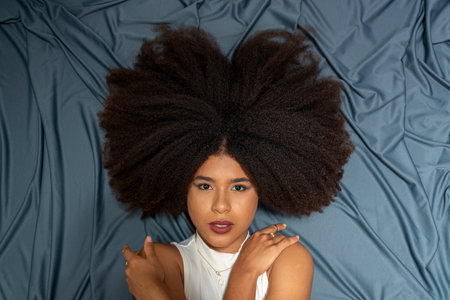 Beautiful young woman, with black power hair, looking at the camera lying on the floor with a gray cloth background.