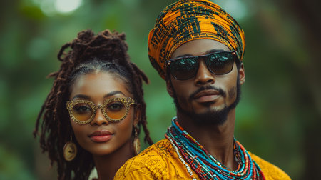 A fashionable couple wearing African-inspired clothing and sunglasses, standing outdoors amidst lush greenery. Vibrant colors and style convey confidence, cultural pride, and an essence of modern and traditional fusion.