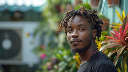 A young black man, likely a repairman, stands confidently outdoors near an air conditioning unit, surrounded by lush plants. The image conveys professionalism and nature's harmony.