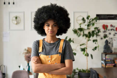 Confident African lady with Afro hair looks at camera stands in cafe, portrait.