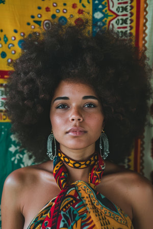 A woman with afro hair surrounded by women in orange head wraps, AI
