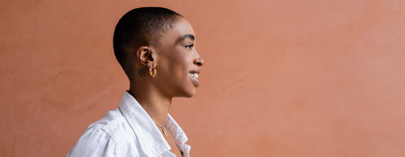 Side view of stylish african american woman standing near wall outdoors, banner