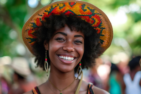 Portrait of a smiling woman with curly hair wearing a vibrant, embroidered sombrero in an outdoor setting.