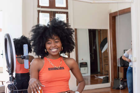 beautiful young brunette hispanic latina girl with afro, fashionable, smiling and having fun in a hall, making a video for the networks with her phone.