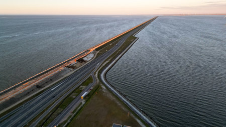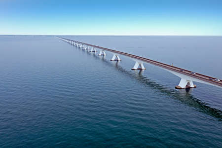 Aerial view on the longest bridge in the Netherlands, Zealand bridge spans Eastern Scheldt estuary, connects islands Schouwen-Duiveland and Noord-Beveland in province of Zeeland, water of Oesterschelde in the Netherlands
