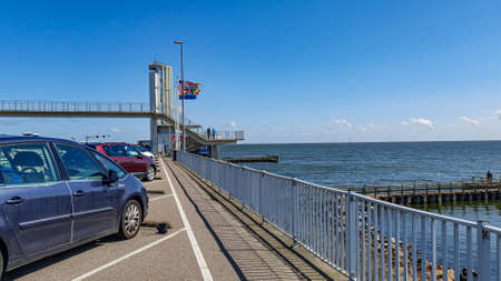 IJsselmeer in the Netherlands. April 17, 2021. Cars parked in Afsluitdijk, stairs, a bridge, flags and the IJssel lake created by closing part of the Zuiderzee in the background, sunny day