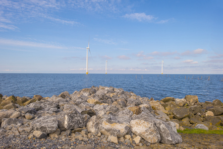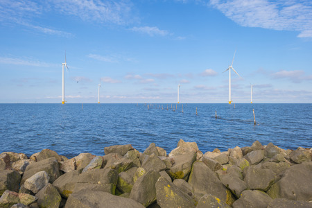 Long row off shore wind turbines along the Dutch coast