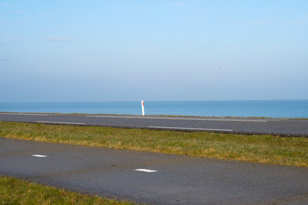 A Cycling path, road and green grassland and a blue sky above it with a lake