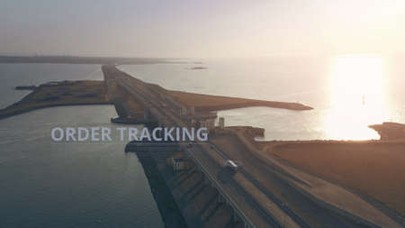 Aerial view of a semi-trailer truck with ORDER TRACKING infographics driving along the highway across the sea
