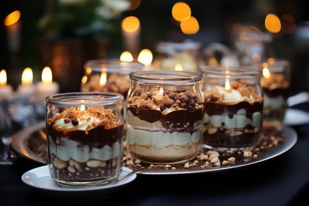 Mix of glasses with various delicious sweet desserts laying on reflective table surface. Sweets decorated with fresh fruit. Self-serving buffet table.