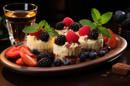 High angle photo of cheese cupcakes with fruits and fruits on a wooden plate, generative AI