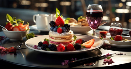a plate of dessert on the dining table, close-up of the dessert. Delectable dessert elegantly presented with fresh strawberries, raspberries, mint on a plate in a fine dining restaurant setting