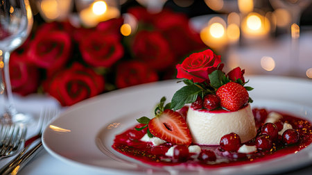Romantic dessert setting with rose panna cotta, berry coulis, and fresh strawberries, styled on a white plate with red roses in the background.