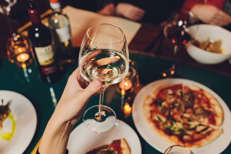 Celebration. People holding glasses of white wine making a toast.