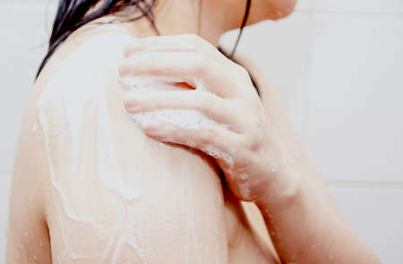 Women shower with soap in the bathroom