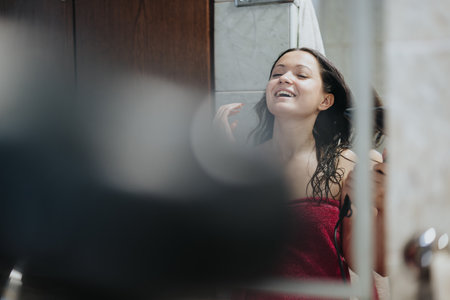 A Joyful Woman Absolutely Enjoying a Refreshing Shower Moment in her beautiful bathroom