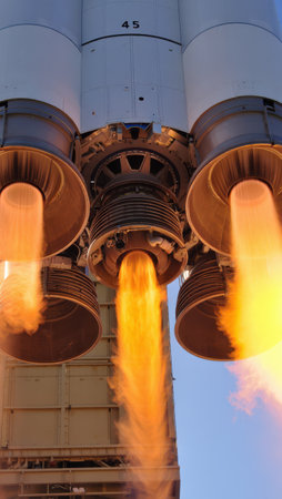 A rocket engine ignites, releasing bright flames that illuminate the evening sky. This dramatic display highlights advanced engineering and energy, symbolizing human innovation.