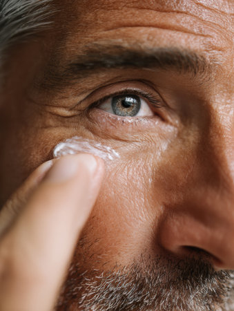 Close-up of a man gently applying a skincare cream around his eye, emphasizing self-care and grooming habits during a daily routine