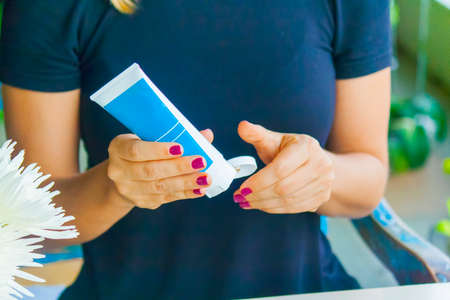 A woman squeezes a cream from a tube to moisturize her skin. Concept of health care of the hand.