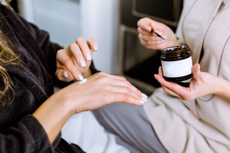 Allergy test and cosmetology consultation. Cropped image of professional female cosmetologist giving cream for her client hand while testing it for allergy. Woman client applying cream on her hand.