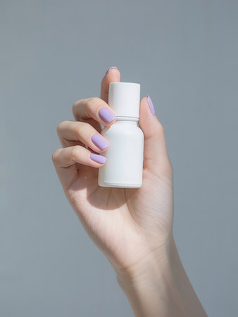 Female hand with purple nail design holding bottle of nail polish, isolated on gray background