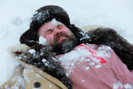 Guy in winter special clothes on a snow-covered field against the backdrop of a countryside landscape.Lies on crystal white snow.