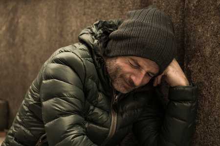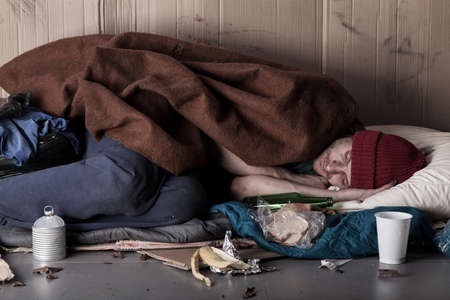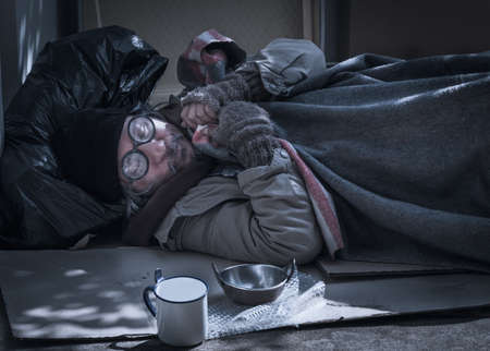 Homeless and frozen man covers himself with a blanket