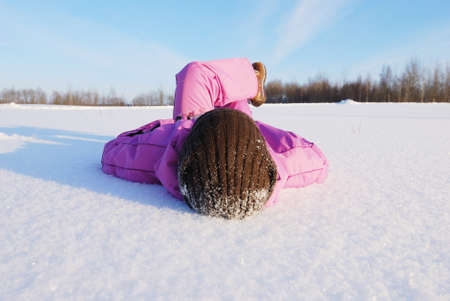 The boy lies in the snow in winter.