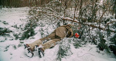 Fallen Soldier Of United States Army Infantry At World War Ii. Army Corpsman Crushed By Tree. Re-enactor Dressed As Usa Soldier Medic In Winter Season. Heroes Of War. Army Of World War Ii