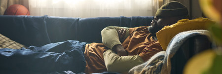 African American man resting on a navy blue couch during daylight with arms crossed, wearing casual clothes and a beanie, room softly lit through curtains