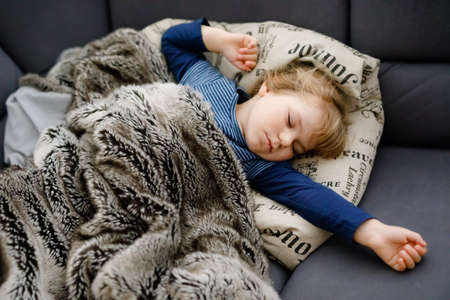 Cute little toddler girl sleeping in bed. Adorable baby child dreaming, healthy sleep of children by day.