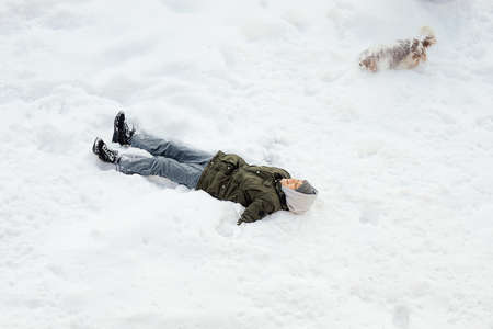 boy lies in snow, enjoys winter, next to him is dog, happiness, childhood. View from above. Cavalier King Charles Spaniel and teenager.