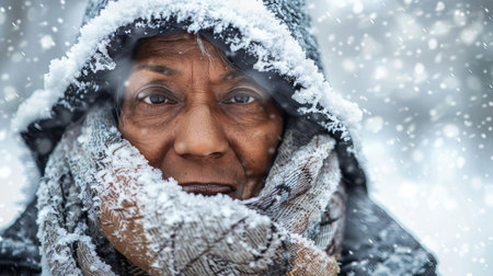 Elderly African American Woman in Warm Winter Clothing Standing Outside in Falling Snow. Concept of Winter Season, Outdoor Activity, Enjoying Nature, Cold Weather.