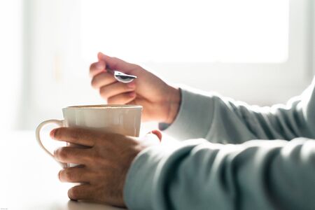Person drinking a cup of coffee with a spoon