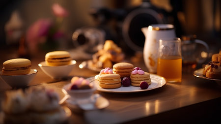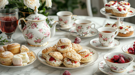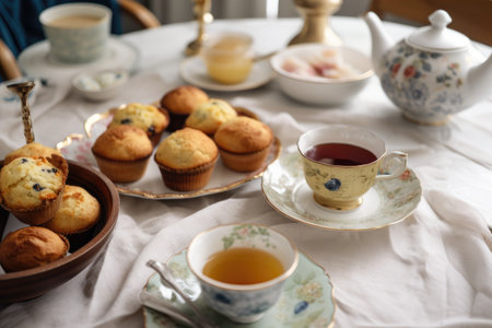 morning tea party with scones, muffins, and tea for two, created with generative ai