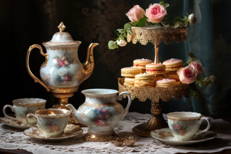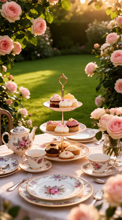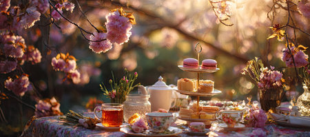 An inviting outdoor scene features a tea table laden with treats and floral arrangements. Teacups, a teapot, pastries, and blossoming flowers create a warm and inviting atmosphere. Soft lighting and a shallow depth of field highlight the delicate textures and colors. This image is suitable for various commercial purposes, including lifestyle and food-related content.