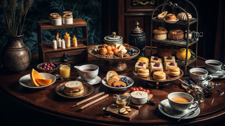 Elegant afternoon tea set with scones, finger sandwiches, and a selection of fine teas served in vintage china.