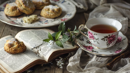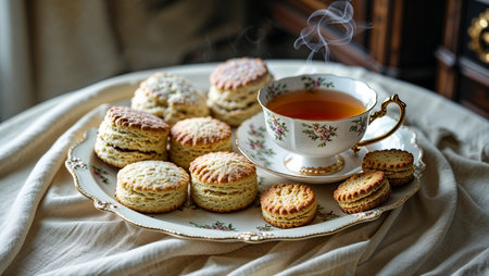 Delightful afternoon tea with scones and cup of steaming tea in a cozy, sunlit setting