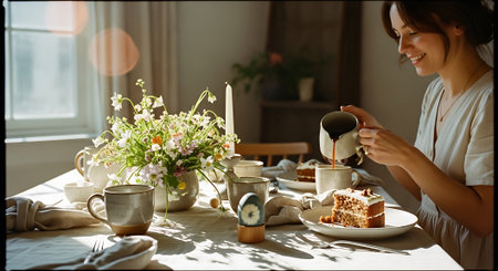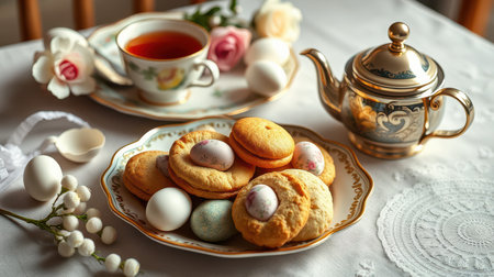 A cozy Easter brunch spread with a warm pot of tea, scones, and fruit preserves, complemented by a backdrop of Easter-themed decor and floral arrangements.