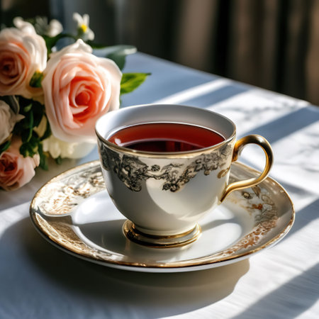A delicate floral teacup filled with tea on a saucer in a cozy setting