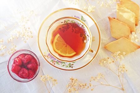 a cup of tea on a table with a white tablecloth and flowers. drink