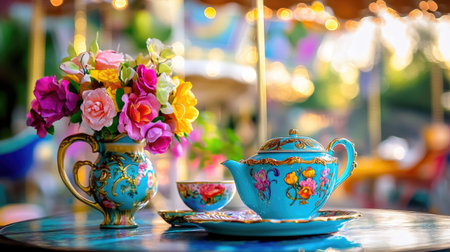 Soft-focus image of ornate carousel and dainty tea set in vintage decor