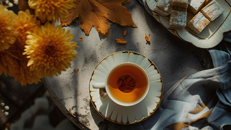 A warm cup of tea, autumnal flowers, and sweet treats create a cozy scene perfect for a relaxing autumn afternoon.