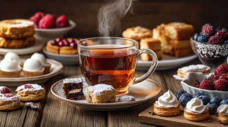 A steaming cup of tea with a dessert spread of cakes, biscuits, and pastries on an old wooden surface. Capturing the essence of a vintage tea party