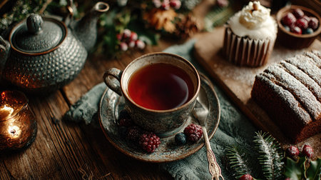 A warm and inviting tea setup featuring a beautifully crafted cup, a vintage teapot, and an assortment of sweet treats perfect for cozy moments.