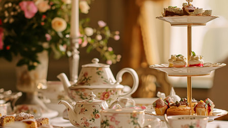 An inviting scene presents a tea setting featuring a decorative teapot and teacup accompanied by pastries on plates. Lush floral arrangements in vases add color, set against a blurred indoor backdrop. The warm lighting and soft textures suggest a comfortable, interior setting, suitable for various editorial and promotional applications.
