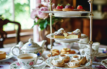 A classic high tea setup featuring a three-tiered dessert stand filled with assorted pastries, tartlets, and scones, complemented by fine china teacups, all set against a backdrop of lush greenery and natural light.
