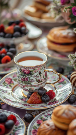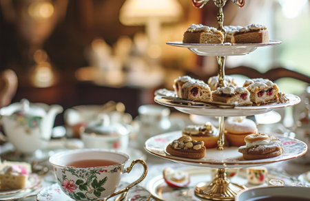 Elegant afternoon tea setting with pastries and teaware in a luxurious parlor