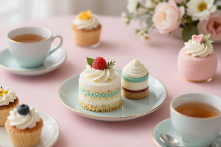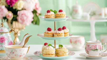 An inviting afternoon tea setting featuring delicate raspberry cakes on a tiered stand, complemented by floral decor and pastel colors, creating a serene ambiance.