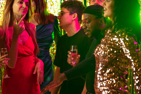 Cheerful friends hanging out together, celebrating holiday and having fun. Clinking glasses